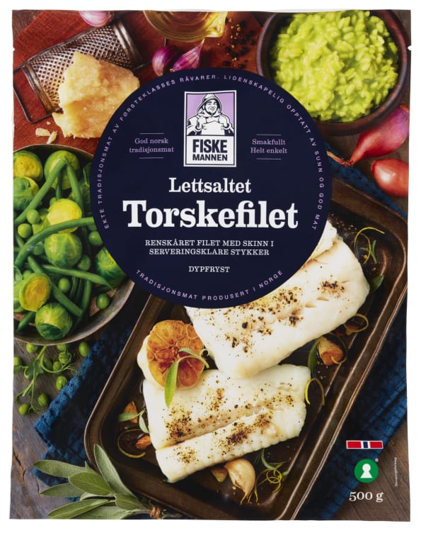 Lettsaltet torskefilet med skinn i serveringsstykker. Serveres gjerne med gulrotstuing, poteter og bacon.